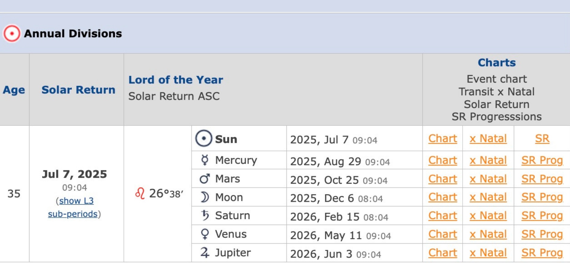 astro-seek มี feature เกี่ยวกับการแบ่งระยะเวลาของปีตามดาวที่ให้อิทธิพลต่อดวงชะตาในช่วงนั้น ๆ เรียกว่า Annual Divisions ซึ่งช่วยในการดูว่าเจ้าชะตาได้รับหรือควรใช้อิทธิพลจากดาวนั้นอย่างไรในช่วงนั้นของปี ก่อนใช้ Annual Divisions ผู้ใช้จำเป็นต้องรู้จัก